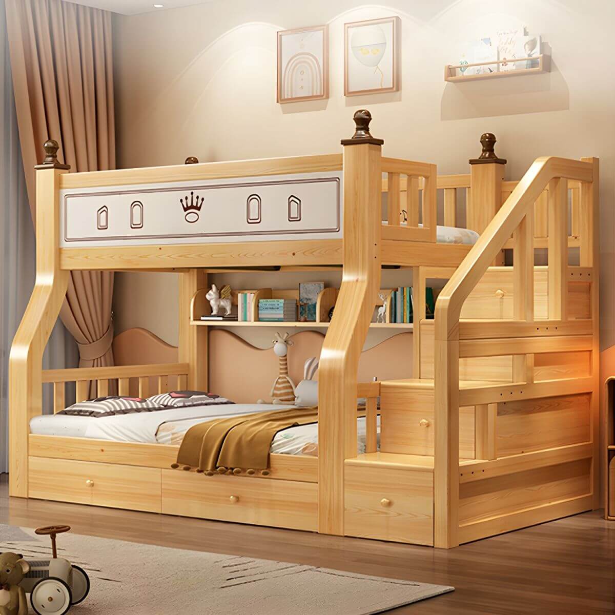 This thoughtfully designed natural-finish pine bunk bed blends modern aesthetics with smart, child-centered functionality—featuring a sculptural crown-accented headboard, soft upholstered lower backrest, five-drawer ladder, open bookshelf, and safety slide. Its light wood tone and gentle curves create a warm, inviting presence in any toddler or kids’ bedroom.