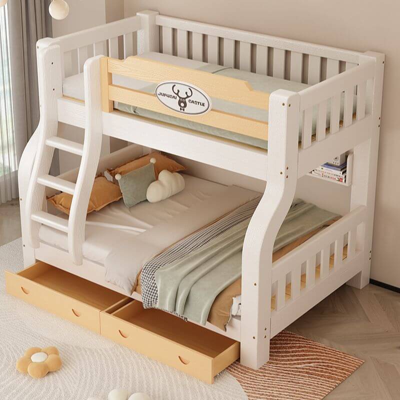 This thoughtfully designed bunk bed blends clean modern aesthetics with practical functionality for growing children. Crafted from solid wood with a natural finish and subtle white-accented framing, it brings warmth and quiet sophistication to any kids’ bedroom. Its integrated bookshelf, drawer, and curved ladder make it as smart as it is serene—perfect for compact spaces that demand both style and storage.
