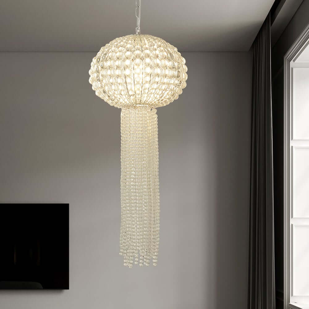 A sculptural 1-light drum pendant that merges organic elegance with modern precision—featuring a tightly packed spherical crown of transparent convex crystal beads and cascading, asymmetrical crystal streamers that evoke the delicate motion of a floating jellyfish. Suspended by a refined silver chain, it transforms any hallway, foyer, or living space into a luminous art installation—glowing warmly when lit, strikingly dimensional when unlit.