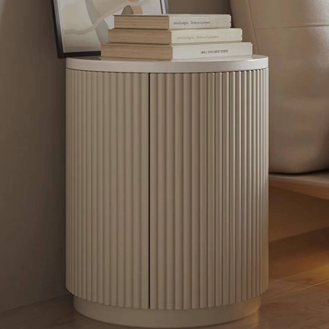 This elegant nightstand combines modern design with functionality, making it the perfect addition to any bedroom or living space. Its sleek cylindrical shape offers a contemporary aesthetic while effectively maximizing space in smaller rooms or corners. Crafted from high-gloss wood, the nightstand features rounded edges for a soft and inviting look.