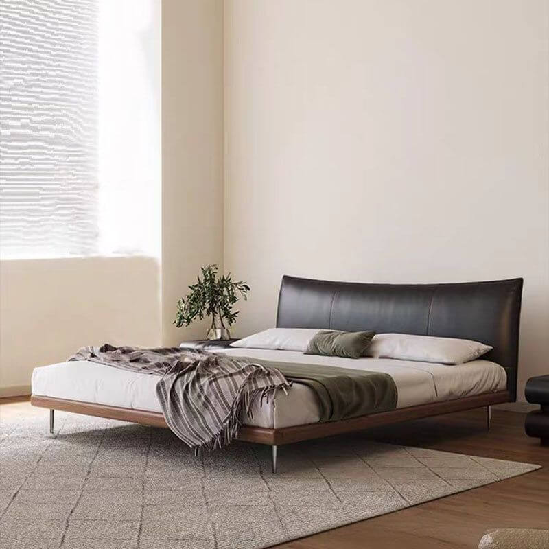 This refined panel bed merges minimalist architecture with tactile luxury—featuring a seamless, soft-upholstered headboard in matte black leather and a warm, natural solid wood base elevated on slender brushed stainless steel legs. Designed for serene, uncluttered bedrooms, it offers quiet sophistication and grounded comfort without visual weight.