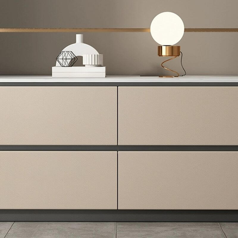 - Four smooth push-to-open drawers with subtle, soft-touch leather-like texture and integrated deep-gray metallic饰带 (5–6mm) forming a precise 'grid' layout
