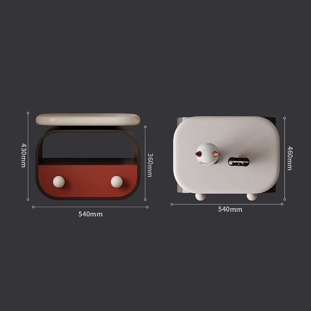 | Color Options | Soft beige top, deep colored base, red drawer |