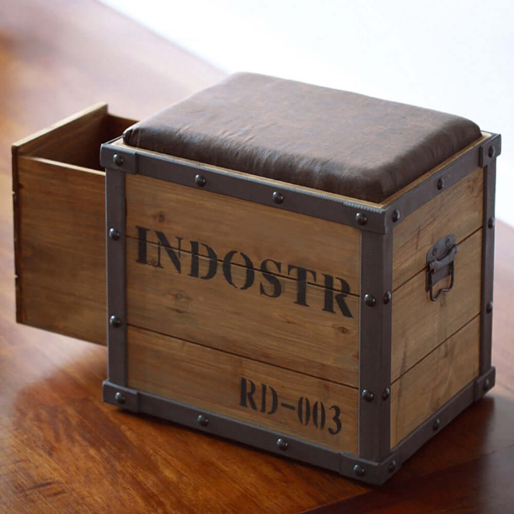 Industrial Natural Pouf Ottoman Upholstered PU Leather Footrest with Distressed Drawer
